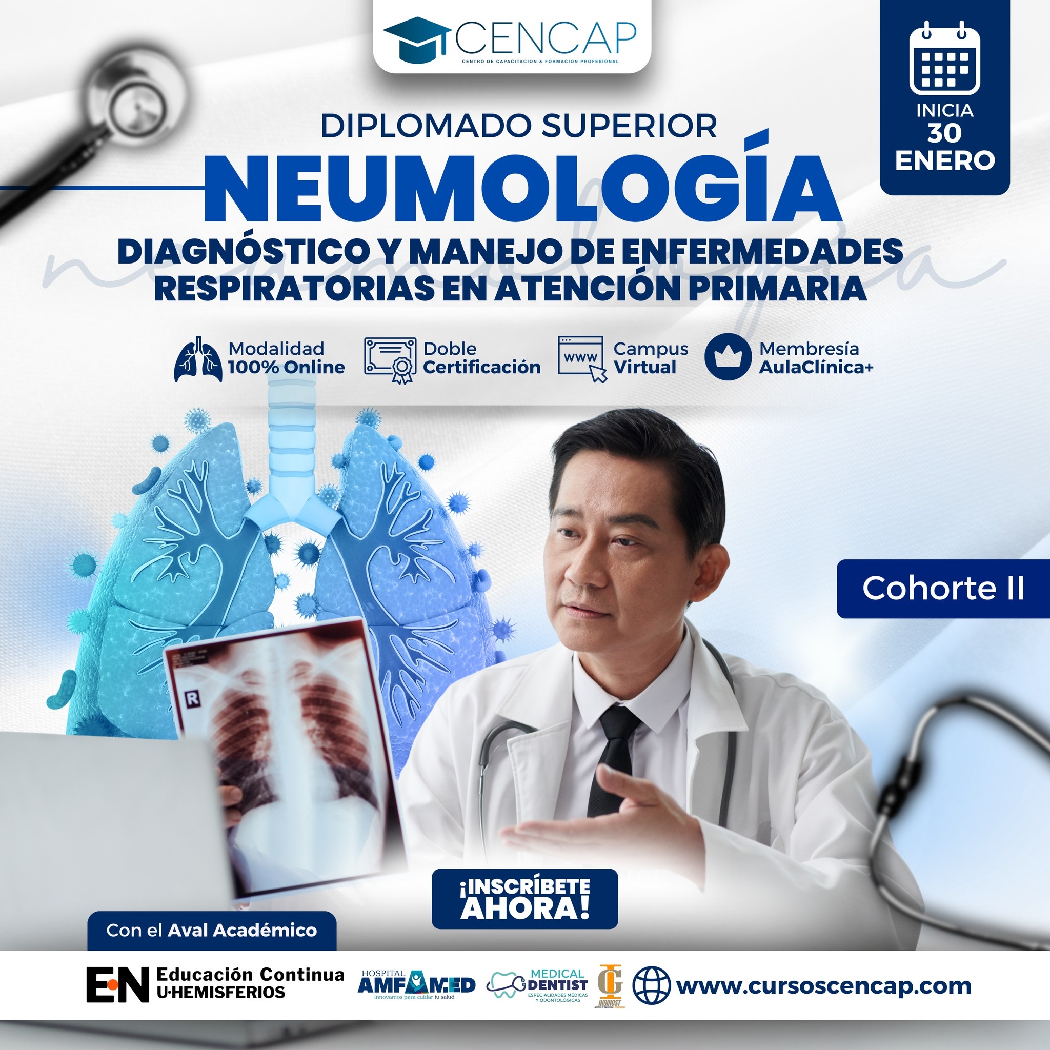 Diseñado con un enfoque integral y práctico, el programa combina una sólida base teórica online con jornadas presenciales intensivas donde se aplican habilidades diagnósticas reales sobre simuladores y pacientes. A través de una metodología activa y actualizada, este diplomado prepara a los participantes para enfrentar los retos del diagnóstico clínico moderno con eficiencia, precisión y confianza.
